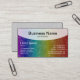 A business card template with a semi-transparent curved header area for the company name and business type etc, with name, job title and other contact details in the section below. The reverse side of the card has been left blank although the base colour is derived using a semi-transparent white image so it matches the semi-transparent header on the front. This can be left blank which is useful for writing notes or can be further customised and/or used for additional text/graphics. This version also has a semi-transparent white texture overlay on both the front and back and a semi-transparent rainbow image on the front which creates the dark rainbow colour variation.