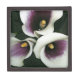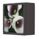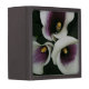 Bouquet of maroon and white calla lilies, with bright yellow stamens