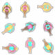 Sticker set of 9 curvy ethnic women in swimming costumes and bikinis floating in inflatable rubber rings