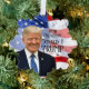 Photo on the front and your custom message on the back of this double-sided ornament greeting card. Donald Trump is elected the 47th President of the United States of America in 2024. Celebrate President Donald J. Trump's win and victory with this commemorative keepsake 47 president 2024 Christmas holiday gift with photo of President Trump, and the red white and blue stars and stripes American flag waving in the background. Show your support as a patriotic American patriot whether republican, independant conservative or other with this beautiful gift accessory for the office or work, for men or women, him or her.