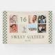 Create your own custom photo collage banner for a 16th Birthday Party. The template is set up for you to add your custom name, age and your favourite photos. Your photos will automatically appear as a photo collage. The banner has a sage green boho style arch and a modern retro checkerboard in cute sage green and cream. The birthday banner is complete with "Sweet Sixteen" and the age 16 lettered in cute script calligraphy typography.