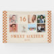 Create your own custom photo collage banner for a 16th Birthday Party. The template is set up for you to add your custom name, age and your favourite photos. Your photos will automatically appear as a photo collage. The banner has a terracotta boho style arch and a modern retro checkerboard in cute terracotta and cream. The birthday banner is complete with "Sweet Sixteen" and the age 16 lettered in cute script calligraphy typography.