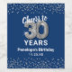 Personalised 30th birthday party wine bottle labels featuring a stylish blue background that can be changed to any colour, glamourous silver sparkly glitter, thirty silver hellium balloons, and a simple text template that is easy to personalise.