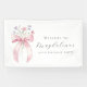 Elegant blush pink coquette bow is decorated with dainty blue and pink wildflowers. Three lines of text let you easily customise your message.