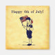 A custom magnet with retro letters reading Happy 4th of July and a vintage drawing of a patriotic boy holding red holiday fireworks and an old US flag on a faux parchment background.