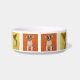 This is a heavy, durable bowl decorated with Tibbies of many colors, the perfect size for hungry/thirsty Tibs. The design is interesting and printing clear.