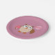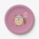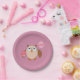This awesome paper party plate features a cute brown owl with big sleepy eyes. The owl is holding a pretty pale pink balloon and a bouquet of bright pink flowers wrapped in a pale pink cone.