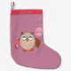 This awesome Christmas stocking  features a cute brown owl with big sleepy eyes. The owl is holding a pretty pale pink balloon and a bouquet of bright pink flowers wrapped in a pale pink cone.