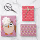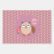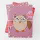 This awesome gift wrap set features a cute brown owl with big sleepy eyes. The owl is holding a pretty pale pink balloon and a bouquet of bright pink flowers wrapped in a pale pink cone.