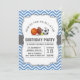 A birthday party invitation featuring all-star sport theme with blue and white chevron and grey grey banner