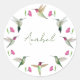Pretty custom sticker featuring a watercolor wreath of Anna's hummingbirds and flowers on a white background.