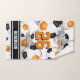This team spirit hand towel for a soccer player features easy-to-personalise athlete name and jersey number plus team & mascot name overlying the background image of a bunch of randomly arranged orange, black and white soccer balls on a white background. The soccer balls are selectively shaded to give them a 3D appearance. The athlete's name can be personalised on horizontal black varsity stripes at the bottom edge of the towel - by katz_d_zynes