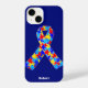 Custom Autism awareness ribbon iPhone 14 case for autistic friends or family. A cool proud autism mum or dad gift that can be personalised with any text below the puzzle piece ribbon of blue, yellow, and red. A neat Asperger Syndrome pride present.