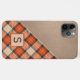 Contemporary tan beige, taupe brown, black, and autumn pumpkin orange coloured tartan plaid, and a faux leather texture pattern background. With room to customise or personalise with a name monogram or initial of your choice. Beautiful, modern, and cool cover for the trend-savvy and art-loving hip trendsetter, artsy motif lover who wants to protect their phone from dust and dirt, wear and tear. This design is available in Apple iPhone 6, 7, and 8 Plus, 10 or X, XR, XS, 11, 12, 13, 14 Mini, 15 Plus, and Pro Max cellphone cases. Show off your style, look fashionable, and feel stylish with a unique design on a mobile device accessory of your choice.