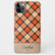 Contemporary tan beige, taupe brown, black, and autumn pumpkin orange coloured tartan plaid, and a faux leather texture pattern background. With room to customise or personalise with a name monogram or initial of your choice. Beautiful, modern, and cool cover for the trend-savvy and art-loving hip trendsetter, artsy motif lover who wants to protect their phone from dust and dirt, wear and tear. This design is available in Apple iPhone 6, 7, and 8 Plus, 10 or X, XR, XS, 11, 12, 13, 14 Mini, 15 Plus, and Pro Max cellphone cases. Show off your personal style, look fashionable and trendy, and feel stylish with a unique design on a mobile device accessory of your choice.