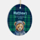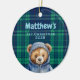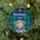 Personalized baby's first Christmas ornament for boy. Teddy bear on plaid background on front. Text with name and birth stats on back.