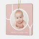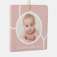 This modern Christmas Photo Ornament is decorated with the word JOY in white on a pink background.