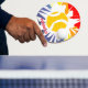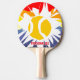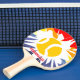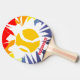 Yellow tennis ball ping pong paddle for table tennis. Colorful dynamic novelty design with ball breaking through hole. Personalized name or monogram ping pong paddle for table tennis