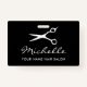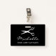 Custom barber shop and hair salon employee name Badge. Classy script typography and custom background colour. Elegant design for hairdresser, hair stylist, barber, employee, coworker, personnel, staff etc. Professional barber scissors silhouette logo. Add your own business slogan or company name. Black and white or custom colours.