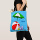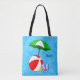 A custom tote with blue script letters and beach or swimming pool themed art of a red beach ball, green sun umbrella, vacation sandals and suntan oil on a watery blue background with waves.