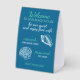 This modern and stylish paper table tent sign features the message: "Welcome to our beach house! Be our guest and enjoy free Wi-Fi. Network: [insert network name] - Password: [insert password]. Enjoy your stay!" The text is displayed in aqua turquoise green and white against a matching teal blue. The sign can also be personalized or customized with your own message. It's a simple and welcoming way to inform your vacation rental guests about the internet login details.