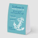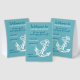 This modern and stylish paper tent sign features a vintage anchor illustration along with the message: "Welcome to our beach house! Be our guest and enjoy free Wi-Fi. Network: [your network name] - Password: [your password]. Enjoy your stay!" The text is in teal blue and white, against a seafoam green background. You can also personalize or customize it with your own message. It's a simple and welcoming way to inform your vacation rental guests about the internet login details.