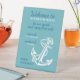 This modern and stylish acrylic pedestal sign features a vintage anchor illustration along with the message: "Welcome to our beach house! Be our guest and enjoy free Wi-Fi. Network: [your network name] - Password: [your password]. Enjoy your stay!" The text is in teal blue and white, against a seafoam green background. You can also personalize or customize it with your own message. It's a simple and welcoming way to inform your vacation rental guests about the internet login details.