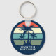 Cute summer family beach house keychain with beautiful palm trees in front of a pretty ocean sunset and blue sky. Customise for an island vacation rental home or tropical seaside trip.