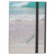 Pretty iPad Air case with built in stand, with a lovely photograph of rippling waves, on the shoreline. Aqua coloured script text, on the right side is ready to personalise for yourself or as a lovely gift idea.