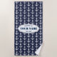 Personalised beach towel with nautical anchor pattern. Elegant navy blue and white print with quote, name or monogram letters. Cute Holiday or Birthday gift idea for him or her. Boat anchor print with custom background colour. Large size for beach or pool. Create towels for friends, family, sailor, sailing enthusiasts, kids, boat captain, dad, mum, brother, uncle, grandpa etc. Maritime ship anchor logo icon design with oval label. Anchors aweigh! Property of template.