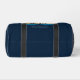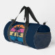 Cute custom beach sunset blue duffel bag for a seaside vacation or family trip to the ocean. Cool personalised gift featuring tropical palm trees and pretty pink and blue with your personalised name or other text.