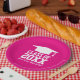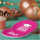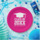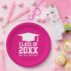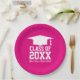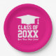 Custom class of graduation party paper plates. Create your own for 2025 etc. Personalised party supplies for high school graduate BBQ dinner party. Disposable fun dinner party supplies printed for students with a diploma. Strong quality suitable for men women and kids. Personalised text, year and customisable background colour ie blue and white. Add personalised name of teammates, school team name, funny quote, slogan or monogram. Design includes graduation hat / cap. Also good for reunion parties. Neon pink. Small and big size.