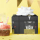 Add a name to the gold label on this custom gift wrap featuring a black tuxedo with a bow tie and a red rose birthday wrapping paper.