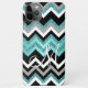 Contemporary white, black, and faux shiny aqua turquoise glitter chevron zig zag stripes pattern. With room to customise or personalise with a name monogram or initial of your choice. Beautiful, modern, and cool cover for the trend-savvy and art-loving hip trendsetter, artsy motif lover who wants to protect their phone from dust and dirt, wear and tear. This design is available in Apple iPhone 6, 7, and 8 Plus, 10 or X, XR, XS, 11, 12, 13 Mini, 14, 15 Plus, and Pro Max cellphone cases. Show off your style, look fashionable trendy, and feel stylish with a unique design on a mobile device accessory of your choice.