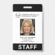 Corporate photo ID badge in a vertical layout. This simple yet professional design features a black border on the top and bottom with white in the middle. The template is personalised with your logo, company name, employee name, title, department / location and employee ID. The bottom border has "STAFF" in large bold letters and may be changed to any title desired. The backside has your contact information and instructions for returning if found. This classic design works great for any type of business.