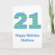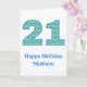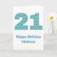 A stylish and vibrant birthday card for a landmark birthday. The front of the card features the number 21 in a bold and modern chevron pattern. The design has a cool toned colour palette of blue, green and turquoise. There is a happy birthday message together with the recipient’s name which makes the card special and unique. The inside message reads “It’s time to celebrate! Happy 21st birthday!”. This card is a perfect way to mark a milestone birthday.