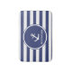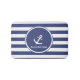 This blue and white bath mat has horizontal stripes. In the centre, there is a white ship's anchor and a place to enter the recipient's name.