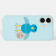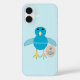 This awesome iPhone case features a cute cartoon of a blue chick. The chick has a pale blue belly and darker blue wings and head with a yellow beak and feet. Next to the chick is a small egg.