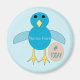 This fun magnet features a cute cartoon of a blue chick. The chick has a pale blue belly and darker blue wings and head with a yellow beak and feet. Next to the chick is a small egg.
