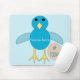 This mousepad features a cute cartoon of a blue chick. The chick has a pale blue belly and darker blue wings and head with a yellow beak and feet. Next to the chick is a small egg.
