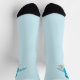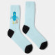 This awesome pair of patterned crew socks features a cute cartoon of a blue chick. The chick has a pale blue belly and darker blue wings and head with a yellow beak and feet. Next to the chick is a small egg.