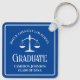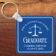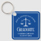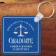 This custom blue law school graduation keychain features white typography for a class of 2025 graduate. Customise with your graduating year under the scales of justice for a great personalised lawyer or attorney gift.