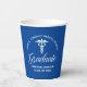 This custom blue medical school graduation party paper cup features classy white typography under a medical caduceus and your college name for the class of 2025. Customise with your graduating year under the elegant calligraphy for great personalised university graduate decor for a nurse or doctor.