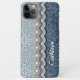 Contemporary pastel violet blue purple and mint green coloured kaleidoscope mosaic floral pattern, and lace flower ribbon on blue jeans denim background. With room to customise or personalise with a name, monogram, or initials of your choice. Beautiful, modern, and cool cover for the trend-savvy and art-loving hip trendsetter, artsy motif lover who wants to protect their phone from dust and dirt, wear and tear. This design is available in Apple iPhone 6, 7, and 8 Plus, 10 or X, XR, XS, 11, 12, 13 Mini, 14, 15 Plus, and Pro Max cellphone cases. Show off your style, look fashionable trendy, and feel stylish with a unique design on a mobile device accessory of your choice.