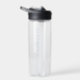Custom clear water bottle featuring your first name displayed in a bold, blue script with your last name displayed in modern lettering below. The simple, personalised water bottle can also be used to display your organisation or business name.