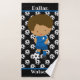 Custom name bath towel for kids featuring a boy playing soccer with soccer ball pattern background.