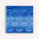 Stylish custom notebook features interlocking ogee shapes ranging from dark blue to light blue and back. In contrast, the continuous S curve outlines shift from light blue to dark blue and back. The painted blue geometric shapes have a pleasing calm look. The paint strokes add variation to the colours and reveal the texture of the watercolor paper they were originally made on.