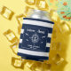 Welcome aboard! Nautical boating can cooler reading your custom boat name surrounded by a compass with an anchor on modern navy blue and white stripes with seagulls as well as a second line of text ready to be personalised. Perfect for the lake house vacation or a weekend boat trip!