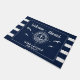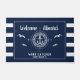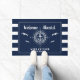 Welcome aboard! Nautical boating doormat reading your custom boat name surrounded by a compass with an anchor on modern navy blue stripes with seagulls as well as a second line of text ready to be personalised.