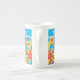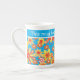 Bone China Mug to personalise, with an all-over pattern of red, orange, yellow flowers on a bright turquoise background; from a handpainted paper collage by Judy Adamson.